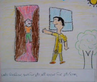 The students were asked to read the piece, discuss the concepts, and then to make flashcards using their own words and illustrations for the story. Children came up with very original drawings to match the story. The students have actually designed a nice resource material to be used in future Bengali classes and the illustrations, rather than being drawn by a professional hand, are ones that the children themselves can relate to.